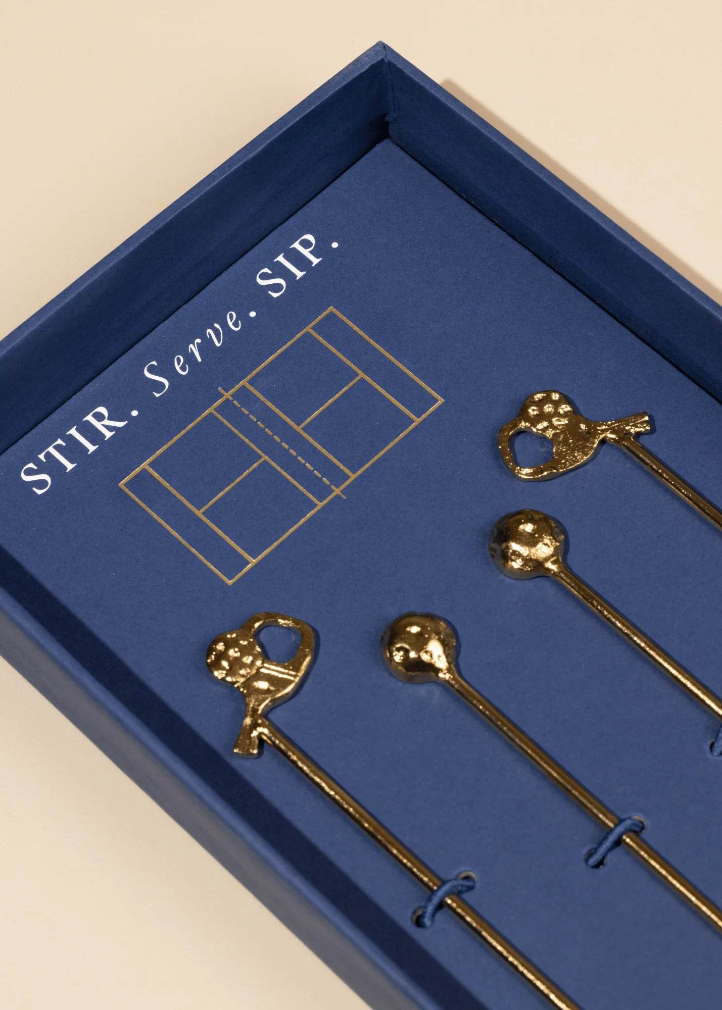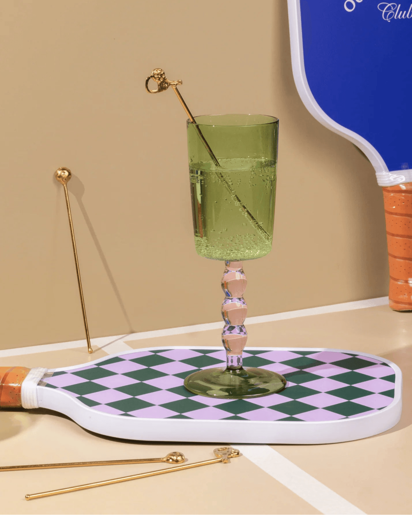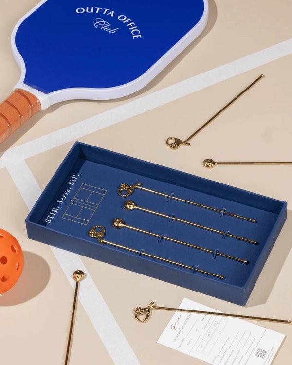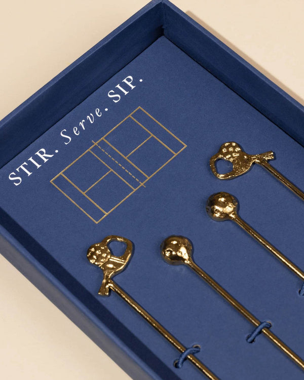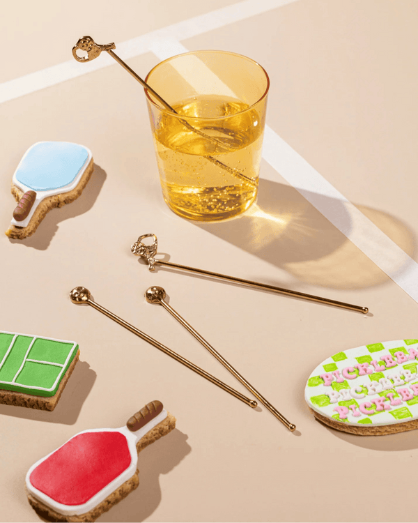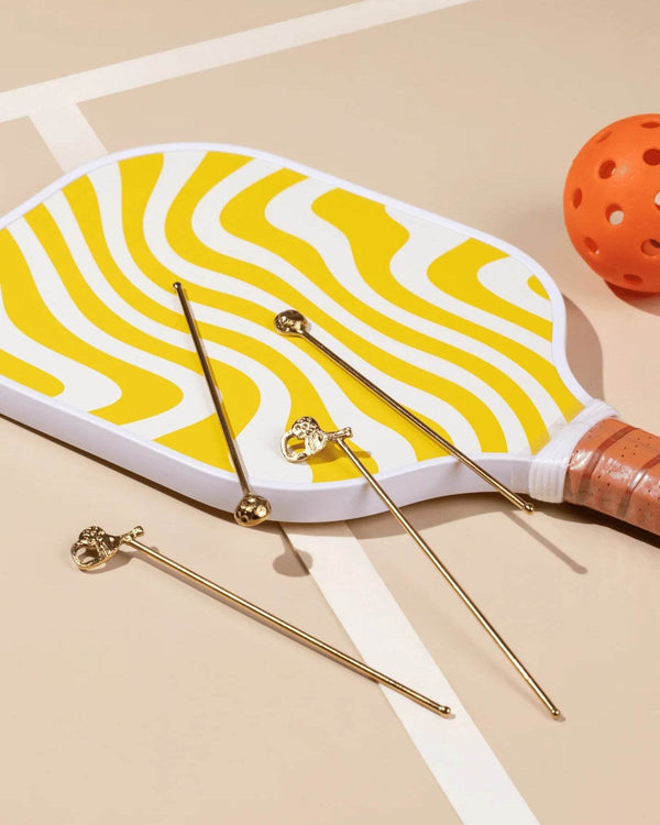 Sip, serve and stir up your game. Inspired by the playful spirit of pickleball and the elegance of cocktail hour, The Court-Side Stirrers are a spirited addition to your barware collection. Handcrafted in brass and designed with miniature paddles and balls, this set blends sporty charm with timeless sophistication.