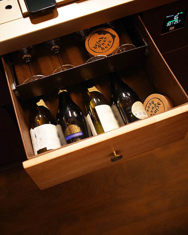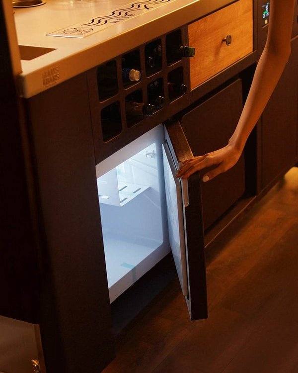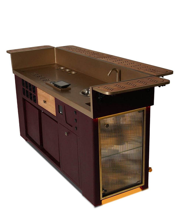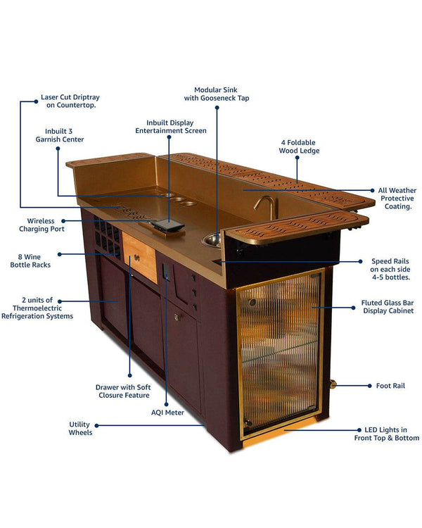 Double Model X 2.0 is a cutting-edge home bar designed for those who seek style and functionality in one sleek unit. Equipped with two thermoelectric refrigerators, it ensures your beverages are always perfectly chilled. The foldable 3-wood ledge adds serving space on demand, while the soft-close drawer, wireless charging port, and AQI meter add modern convenience.