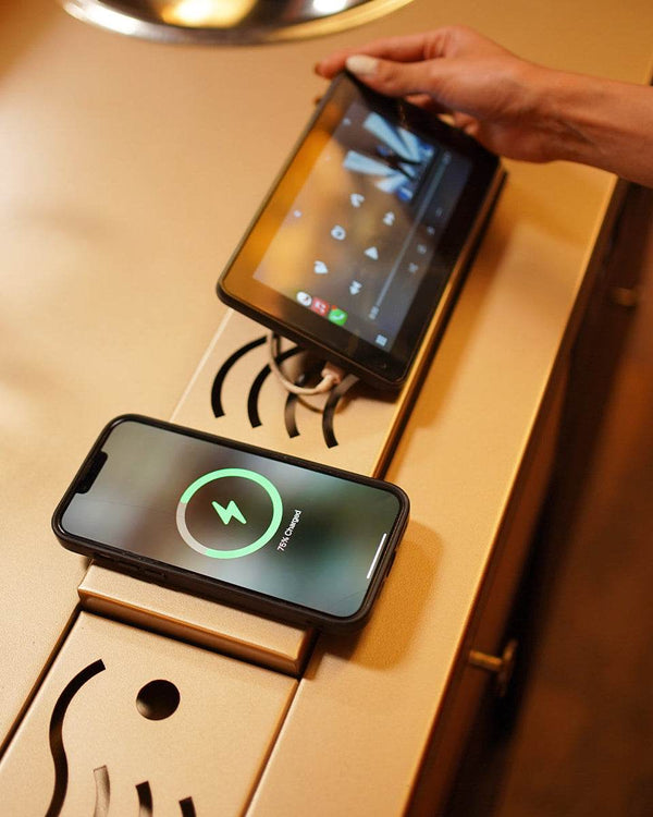 Smart & Functional Features- Includes wireless charging port, soft-close drawer, AQI meter, built-in entertainment screen, and LED lighting for a high-tech experience.