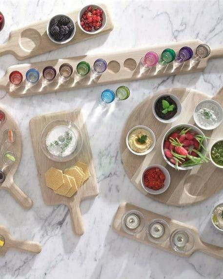 A mixed material party set. Six ombre-coloured shot glasses nestle securely along the length of the natural oak board. The paddle has slim handles at either end. Comes in an attractive packaging and makes a great gift.