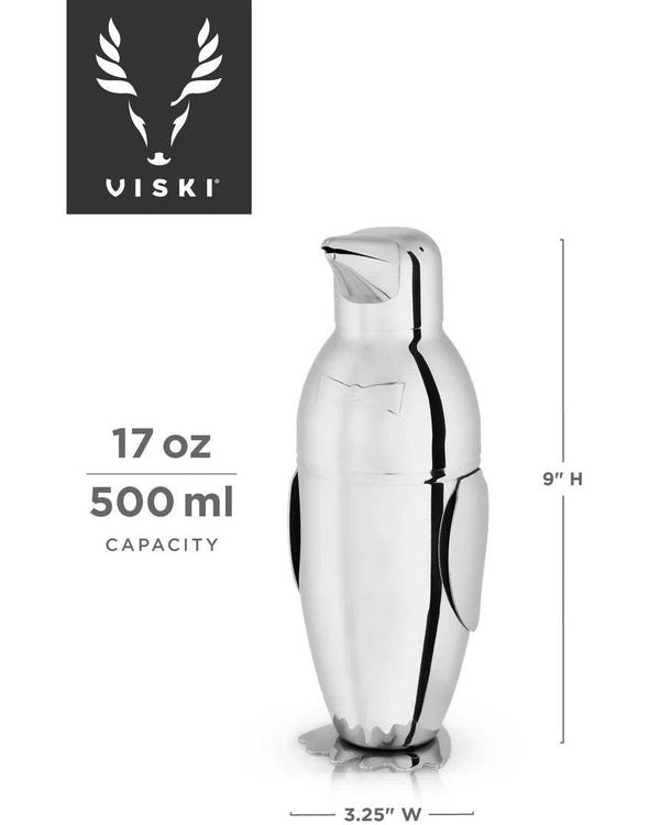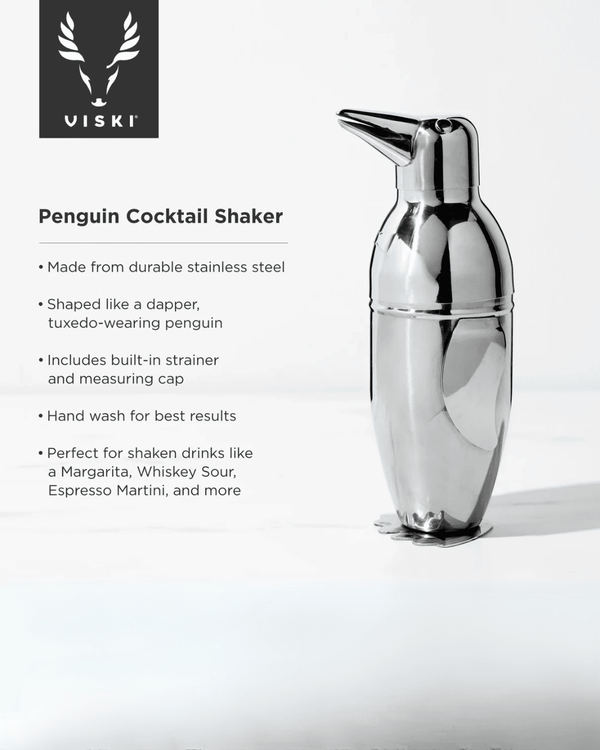 Bow-tied, tuxedo-ed and stately in stainless steel, the Emperor penguin cocktail shaker stands tall amongst standard mixology tools to set your bar collection apart. The vessel holds 17 ounces and incorporates a built-in strainer. Dishwasher Safe. Perfect gift for people with quirky taste.