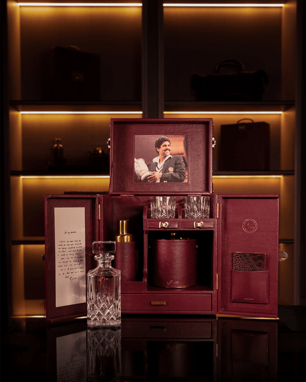 Each bar features a framed image of the historic win, Kapil Dev’s signature, and a personal note from the legend himself. Inside, you’ll find a custom-designed glassware set—one decanter and four glasses—etched with his autograph and score. Dedicated compartments elegantly store the included bar tools, ensuring both form and function.