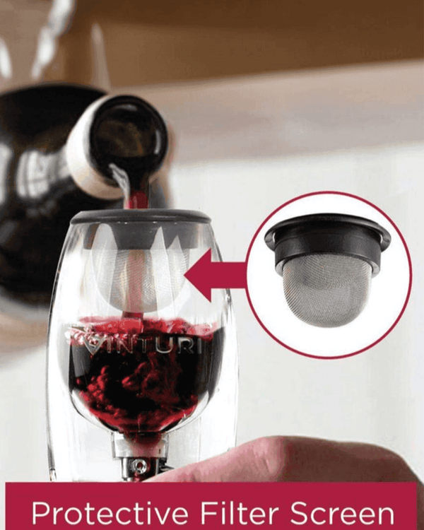 Accelerate a wine's aeration process with the Vinturi red wine aerator. This award-winning aerator opens and develops red wines in the time it takes to pour a glass, no more waiting as with traditional decanters. Suitable for all red wines, it has patented technology and a stylish yet classic look. A unique sound lets you know that you have an authentic Vinturi aerator. It comes complete with a no-drip stand for properly displaying the device and keeping wine off surfaces when it is not in use. It has a filter screen that protects your wine from bits of cork and sediment.