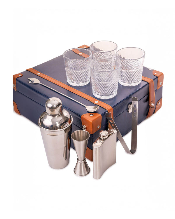 Box Contains - 1 Portable bar, 4 whisky glasses, 1 cocktail shaker, 1 corkscrew opener, 1 peg measurer, 1 tong, 1 spoon