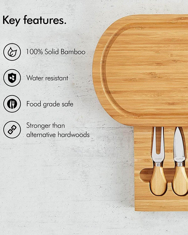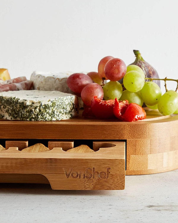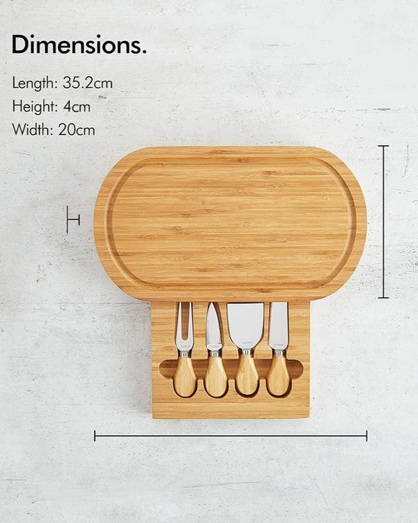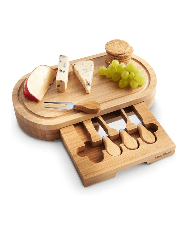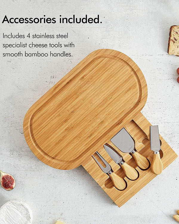 Slice and serve fine cheeses in style with the beautifully crafted VonShef Oval Cheese Board and Knife Set. Perfect for cheese connoisseurs, the set will make a chic centrepiece at dinner parties and get-togethers. Constructed from sustainable and environmentally-friendly 100% bamboo wood, the board is framed by a groove to keep crumbs in check. The board comes with a concealed pull out tray, which stores the specialist cheese tools. The set includes a stilton knife, cheddar knife, hard cheese knife and cheese fork - all with hard-wearing stainless steel blades and smooth bamboo handles.