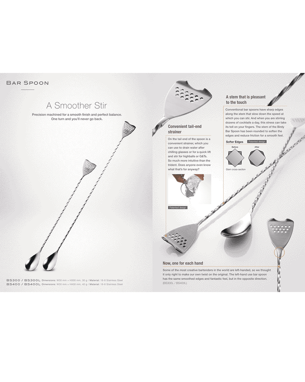 This conventional bar spoon has sharp edges along the stem that slow down the speed at which you can stir. The stem of the bar spoon has been rounded to soften the edges and reduce friction for a smooth feel.