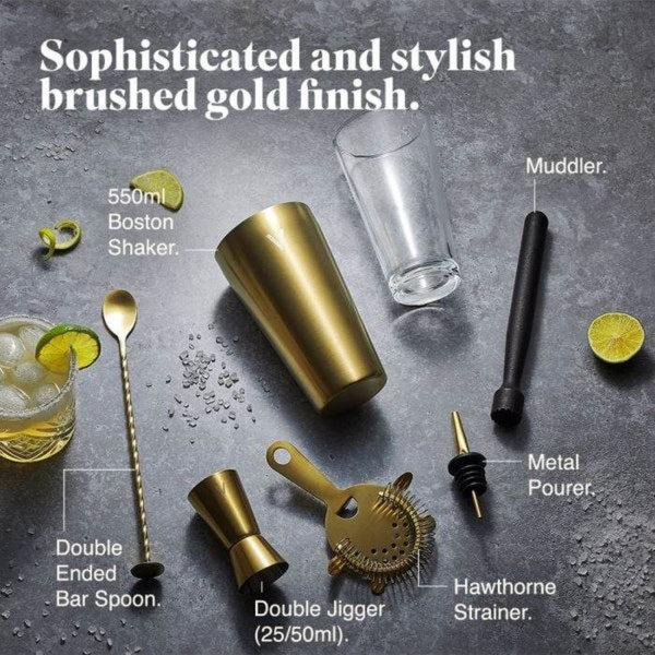 Contents- 1 boston shaker, 1 bar spoon, 1 muddler, 1 jigger, 1 strainer, 1 pourer and 1 recipe guide