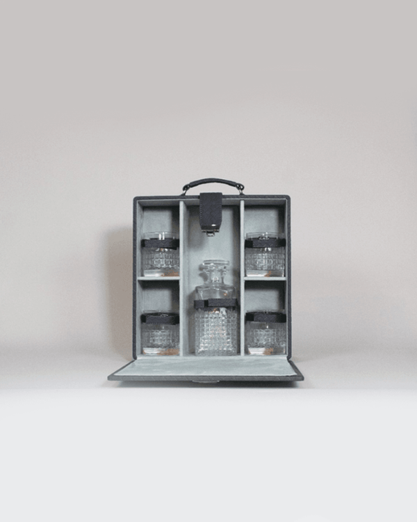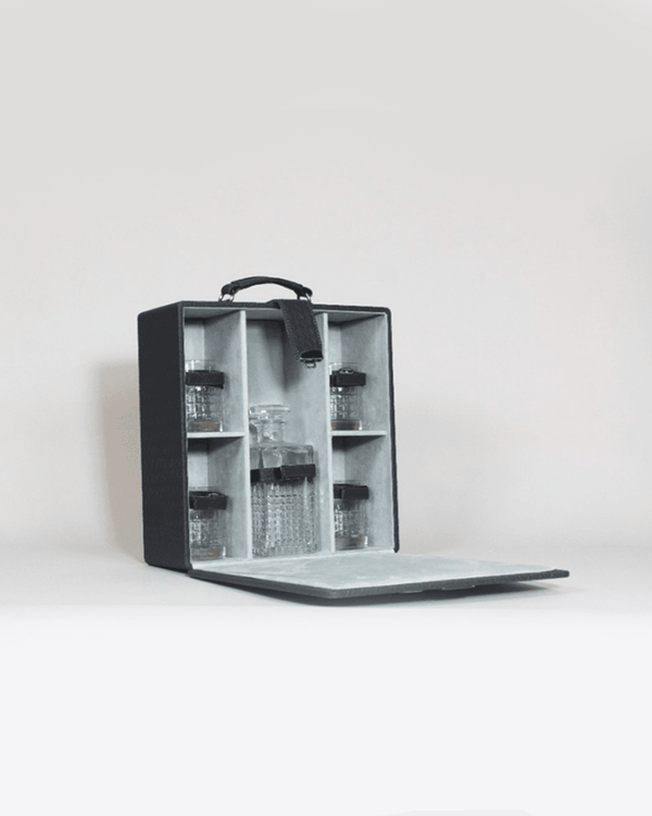 What better way to gift it in than the perfect Briefcase gift set which makes quite an impression! The gift set, a fine accessory of the entwine collection is thoughtfully designed to hold a Wine/Whisky bottle along with 4 Glasses. These can be strapped in to keep anything from breaking during transport. Lined with soft suede fabric and fitted with a leather handle and a metal lock gives it a very elegant look and makes it a gift to remember. Glasses and Bottle not included.