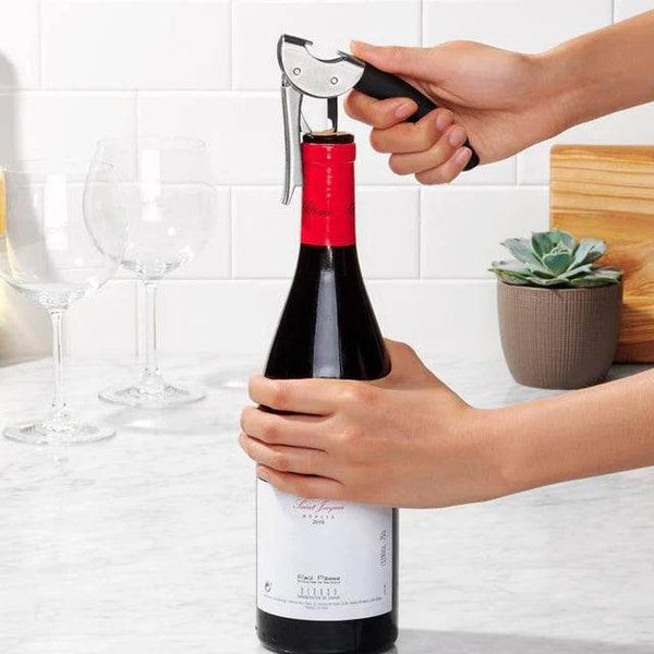 Designed to remove corks in 2 simple motions, OXO’s Double Lever Waiter's Corkscrew combines slim, compact form with no-fuss function. The non-stick screw glides smoothly into corks, then the second lever retracts for easy cork removal. Bottle opener is integrated into the comfortable, non-slip handle. Foil cutter folds out of the handle.
