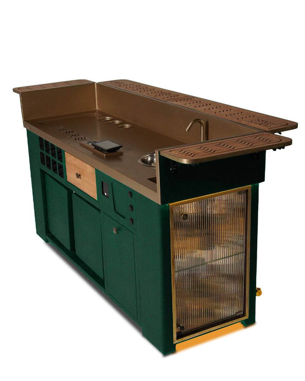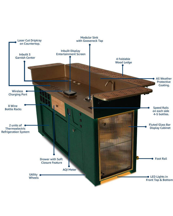 Spacious & Organized Storage- Equipped with 8 wine racks, dual speed rails, 3 garnish centers, and 2 fluted glass bar cabinets that hold up to 40 bottles in total.