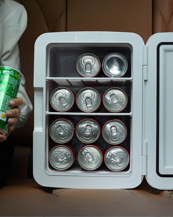 Portable personal fridge with compact size, 10L capacity enough to store up to 12 cans of 12oz soda. Suitable for car, office cabin or bedroom. Its size makes it multifunctional to keep drinks, milk, juice, yogurt, or even cosmetics at optimal temperatures.
