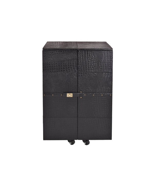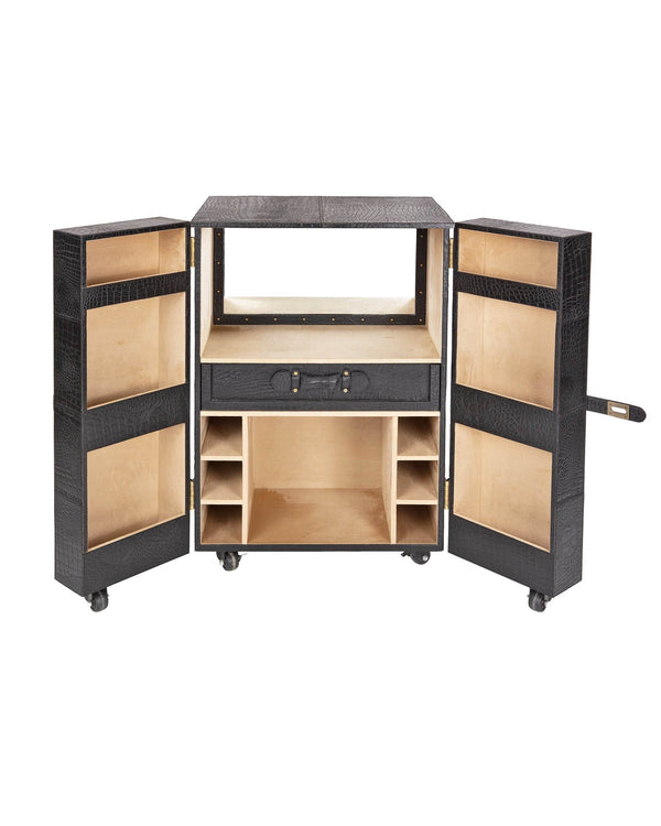 The front open bar is a medium-sized bar cabinet that aesthetically opens in the front. Its multiple interior sections and antique metal detailing add to its functionality and charm. With easy mobility and a compact design, this bar cabinet fits seamlessly into any space.