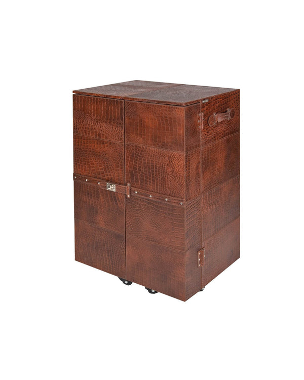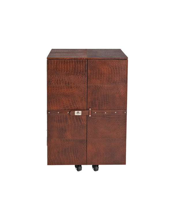 The front open bar is a medium-sized bar cabinet that aesthetically opens in the front. Its multiple interior sections and antique metal detailing add to its functionality and charm. With easy mobility and a compact design, this bar cabinet fits seamlessly into any space.