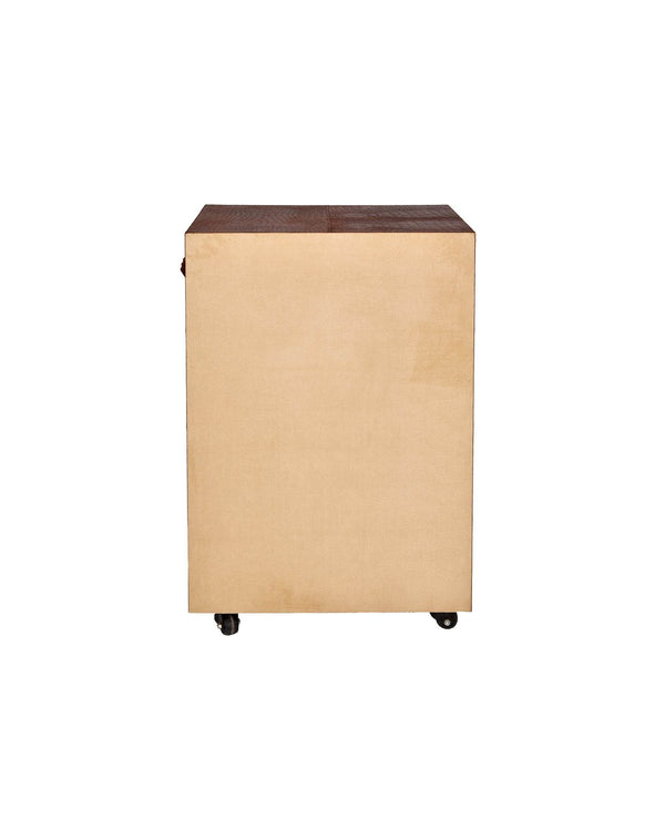 Secondary Material- MDF body frame, faux suede inner lining, antique brass metal hardware, stainless steel casters, steel frame, PP wheels.