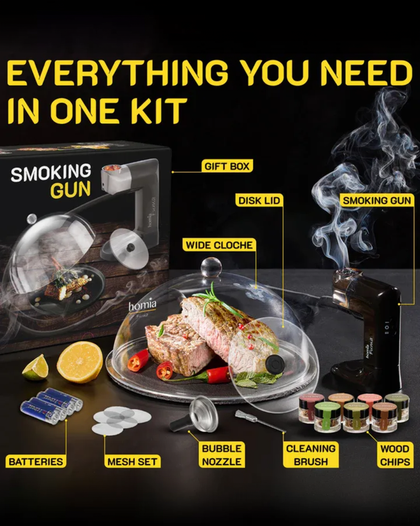 Set includes- Smoking gun, flexible hose, 2 cloches- wide and tall, 1 disc lid, 1 smoking lid, 20 mesh, cleaning brush, 7 flavors of wood chips, 4x AA batteries, User manual, Recipe book.
