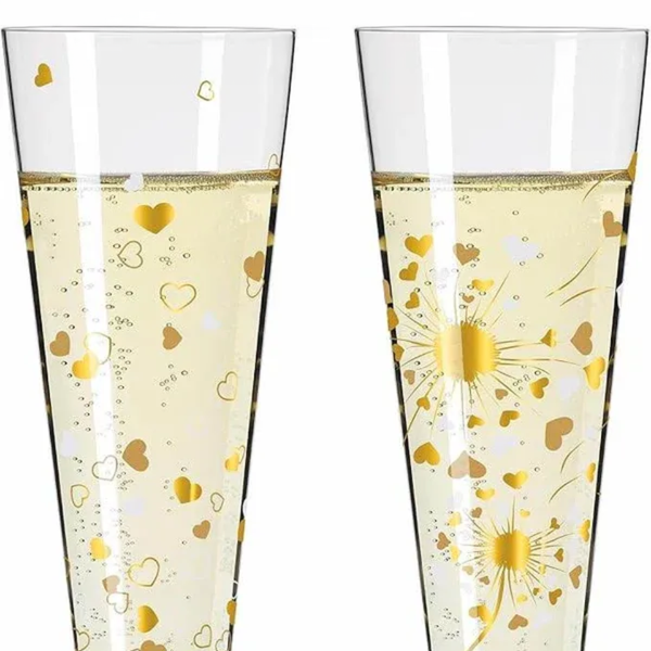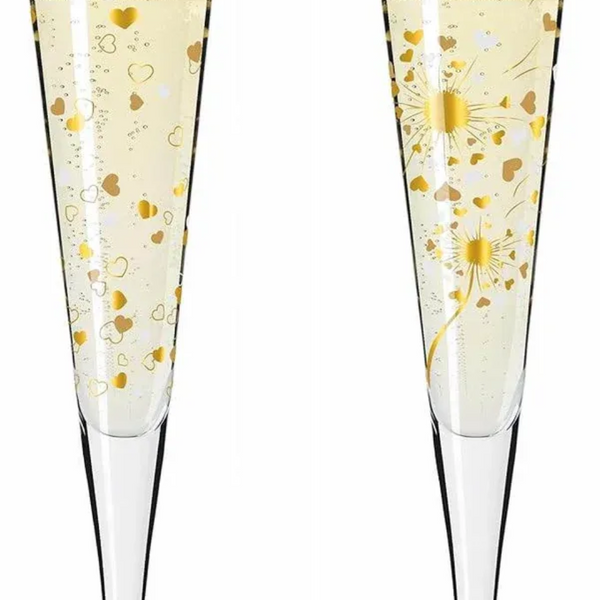 Elegant champagne glasses with golden and silver hearts, sprung from two graceful dandelions, swirl around the champagne glasses. The decorations combine romance, elegance and passion in an enchanting composition. Perfect occasions deserve to be celebrated with perfect glasses.