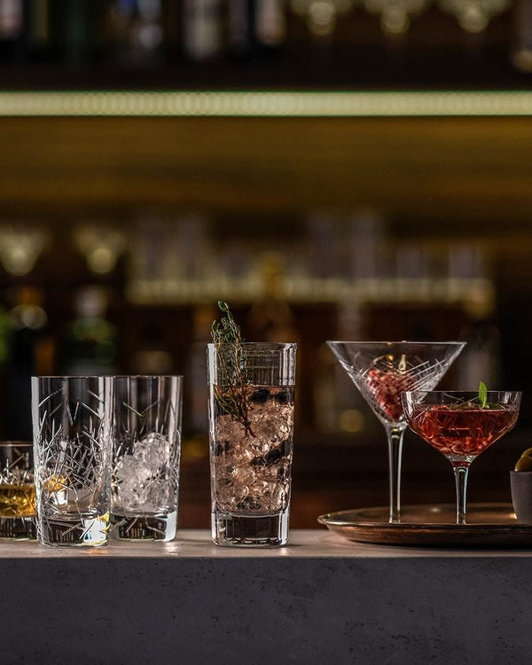 The Hommage Glace Longdrink glass features a sophisticated glass cut that suggests visual movement. It combines glass and beverage to create an extraordinary visual experience.