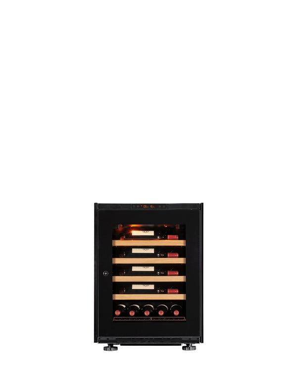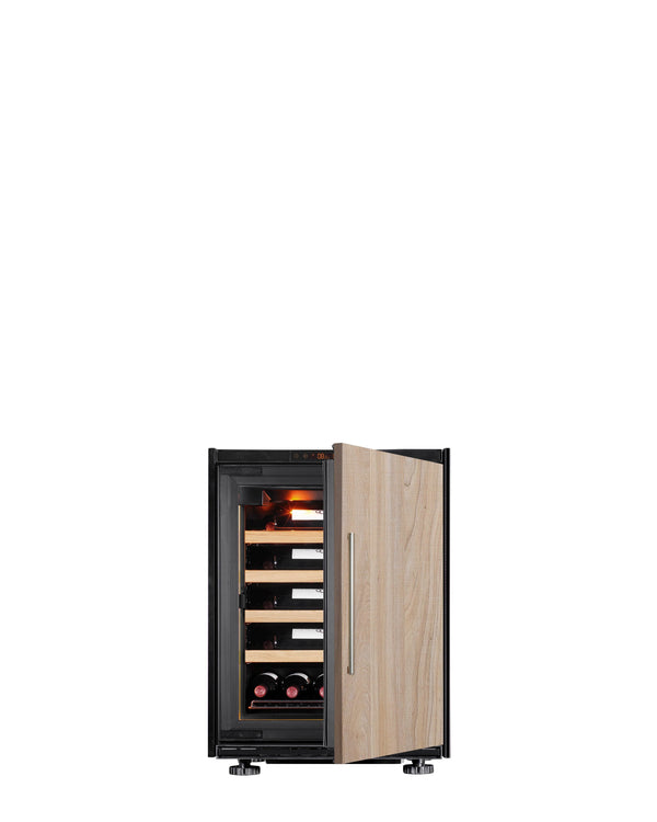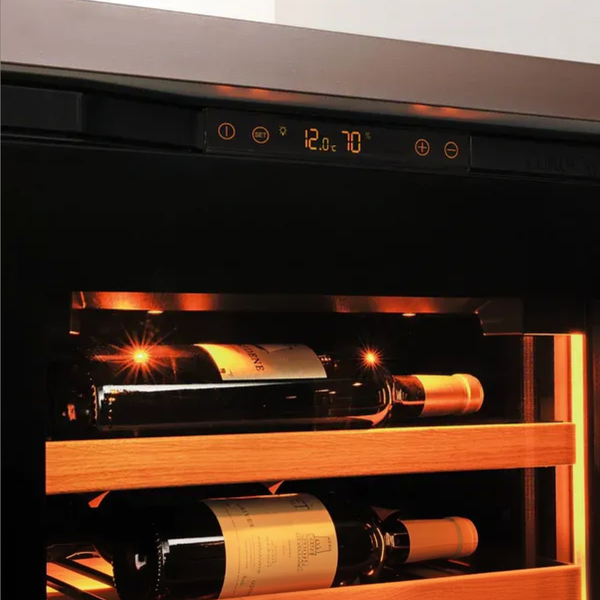 Accessories: 4 sliding shelves with Mains du sommelier; Light oak & glossy black front; 6 removable bottle indicators per shelf; 1 microfiber cloth