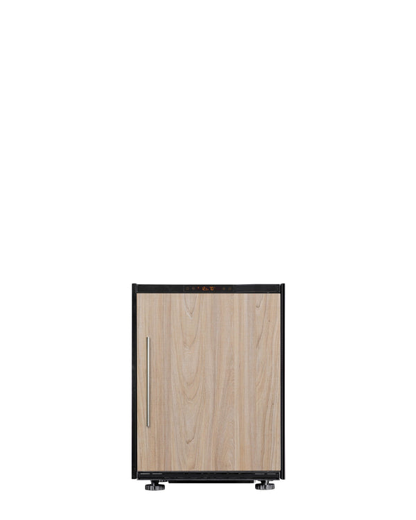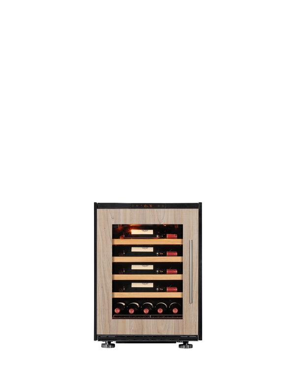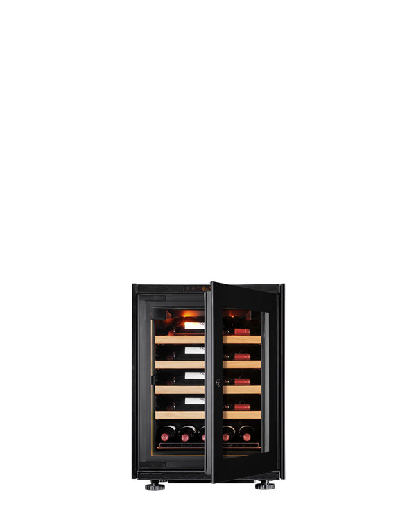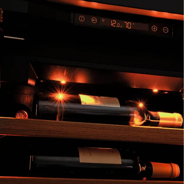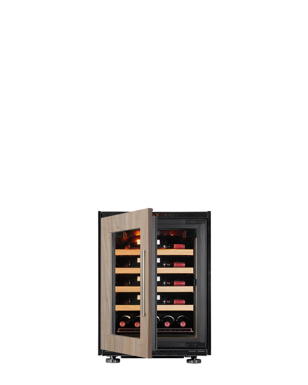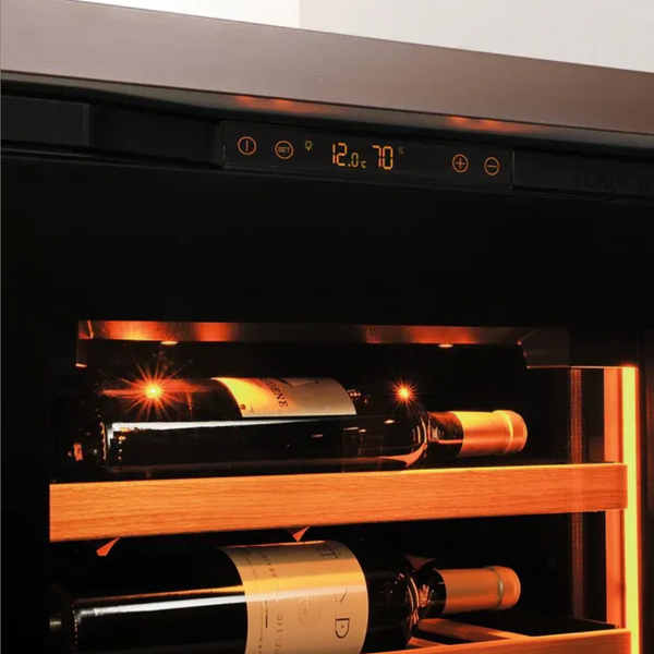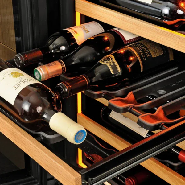 Accessories: 4 sliding shelves with Mains du sommelier; Light oak & glossy black front; 6 removable bottle indicators per shelf; 1 microfiber cloth