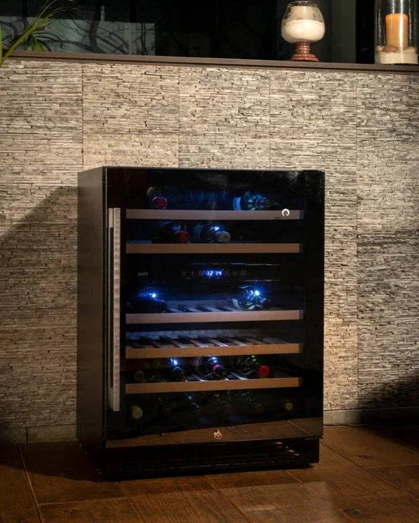 This is a 46 bottle capacity, Free standing/Built in Dual temperature zone wine cooler. For connoisseurs of fine wines, who love to entertain in style, KAFF Wine Coolers are the perfect choice. They store and chill wine to perfection and keep them healthy and perfect tasting. KAFF Wine Coolers are made from superior quality materials that maintain the appropriate temperature required for the integrity of the wine. Our wine cooler also comes with dual temperature wherein you can set temperature for Red Wine and White Wine.
