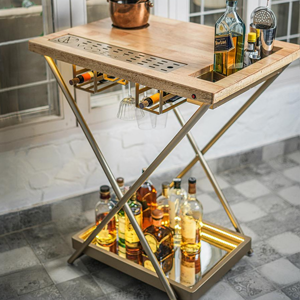 KEY FEATURES: The bottom mirror display shelf can stack up to 10-15 bottles of alcohol, glassware, nut bowls etc. The top of Model J also doubles up as a cocktail station for those evening drinks with a slot for an ice bucket, drip tray and a speed rail. This variation features a Jack structure which is compact and designed in a way that it can be folded and stored in a very small placer. The top also has slots for 4 wine bottles along with space for 6-7 hanging wine/cocktail glasses.