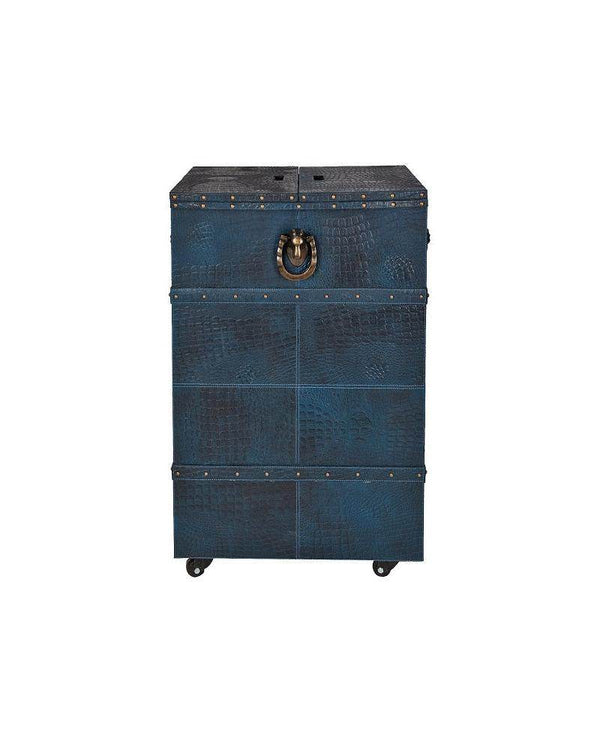 Secondary Material- MDF body frame, faux suede inner lining, antique brass metal hardware, stainless steel casters, steel frame, PP wheels.