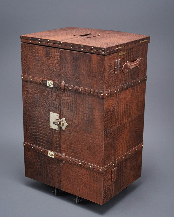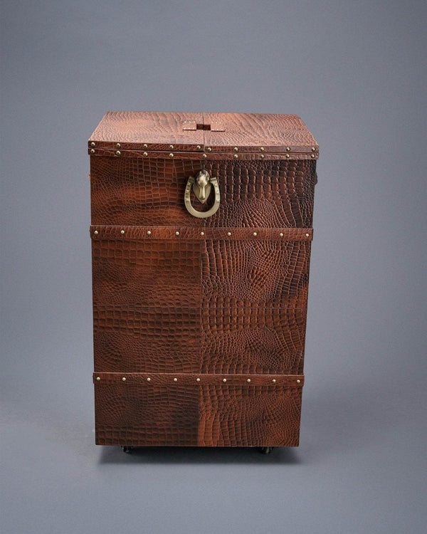 Secondary Material- MDF body frame, faux suede inner lining, antique brass metal hardware, stainless steel casters, steel frame, PP wheels.
