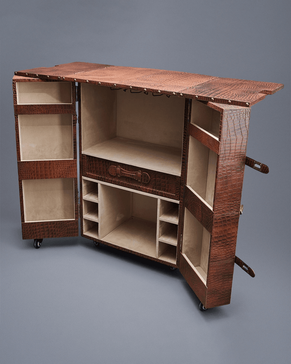 Panama is a medium-sized bar cabinet that expands into a spacious flat top to provide extra space when mixing drinks. Its multiple interior sections and antique metal detailing add to its functionality and charm. With easy mobility and a compact design, this bar cabinet fits seamlessly into any space.