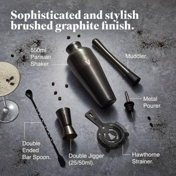 Embark on your mixology journey with a Parisian twist with this Graphite Parisian Cocktail Set. This 6-piece collection is your gateway to a sophisticated yet accessible home cocktail experience. With its cool, understated graphite finish, this vintage cocktail set will effortlessly transform your home bar into a swanky lounge, reminiscent of chic Parisian nightspots. Discover the key to an endless array of cocktail possibilities within this exquisite cocktail set. Whether you're in the mood for vigorous shaking or smooth stirring, these cocktail accessories will help you craft drinks that are as delicious as they are memorable.