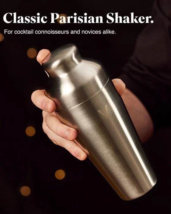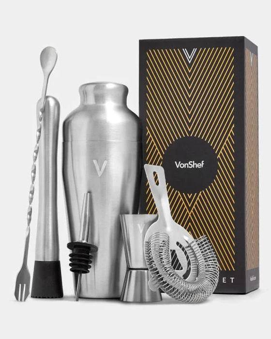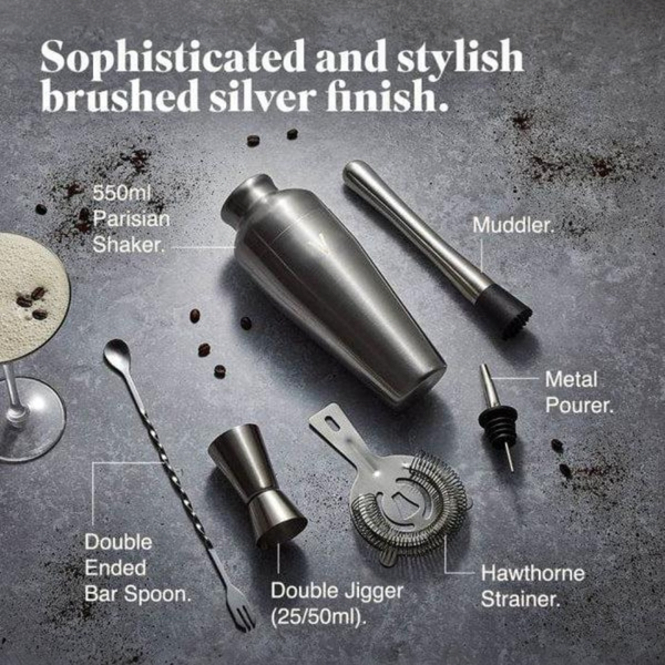 Contents- 1 parisian shaker, 1 bar spoon, 1 muddler, 1 jigger, 1 strainer, 1 pourer and 1 recipe guide