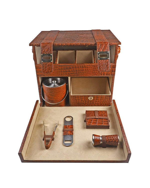 Our Picnic Portable Bar is the perfect accessory for your next outdoor gathering! Handcrafted in Genuine Leather in a waxy finish, it’s lightweight and easy to carry. This bar is spacious enough which makes it perfect for serving drinks and snacks, and has been thoughtfully designed to hold all the essential bar items in a modern way, thus adding a touch of class wherever you go! Its modern flap-down design has a mirror detailing and carries the accessories strapped on. It has compartments to carry 3 bottles, and 4 glasses and has a compartment to store additional accessories or even snack packs.