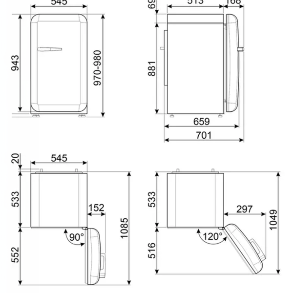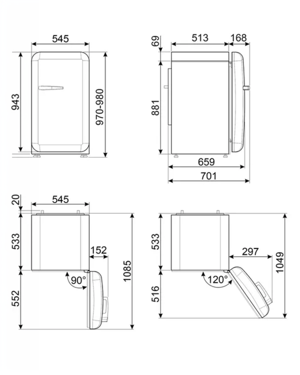 Designed by – SMEG ##Product Type – Refrigerator ##Collection – 50’s style ##Category – Free standing, One door ##Colour – Glossy Red ##Material – Heat moulded steel, glass shelves ##Net Capacity – 122 L ##Freezer Capacity – 17 L ##Voltage – 220-240 V ##Dimensions – Width: 54.5cm ; Height: 97cm ; Depth: 65.9cm ##Weight – 50 kgs ##Warranty – 1+4 years compressor warranty