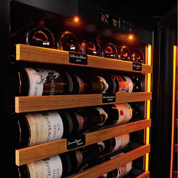 Accessories: 14 sliding shelves light oak/glassy black front. Sliding shelves are soft closing and are equipped with 2 removable cradles for the presentation of your bottles. 6 identification plates per rack. 1 eurocave key ring and 1 erasable marker.