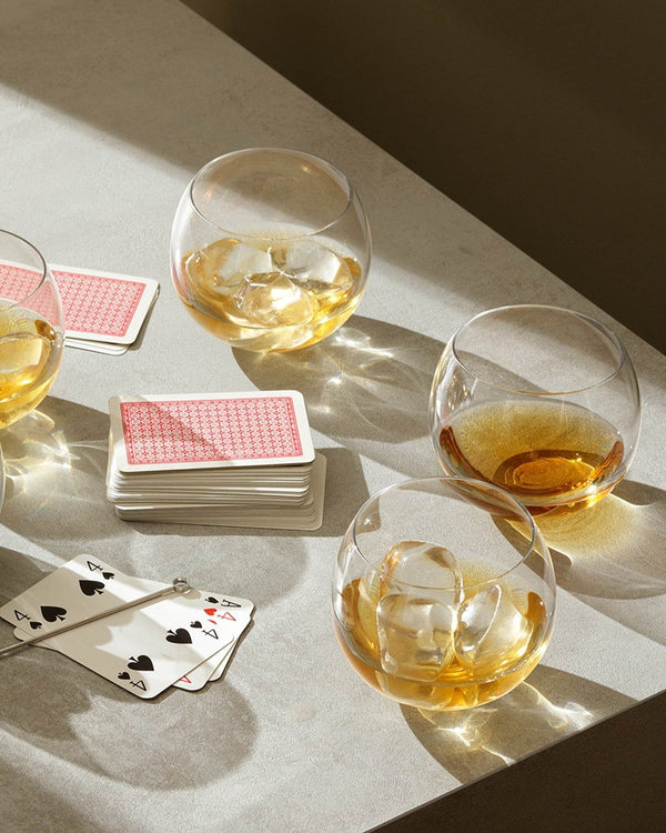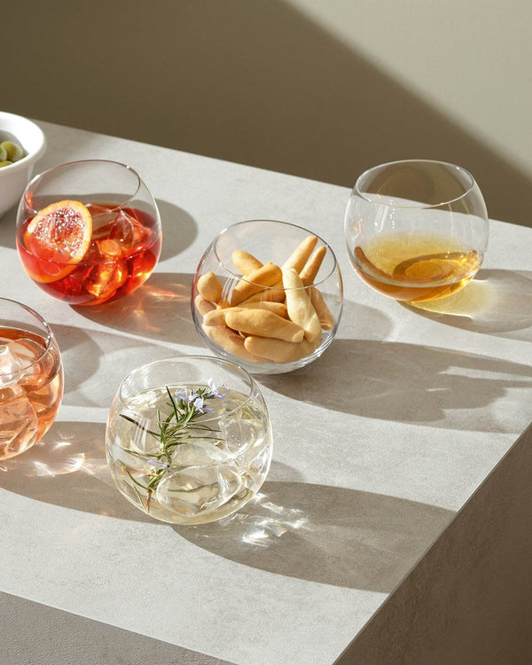 A set of four rocking tumblers balancing on a curved base, causing the glass to rock gently from side to side. The versatile shape can be used for whisky on the rocks, short cocktails and water or as a bowl for nuts and olives.