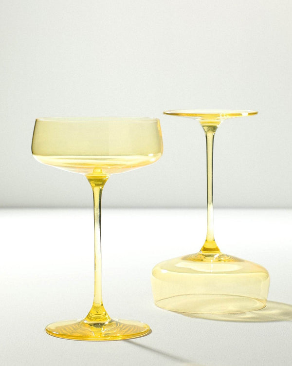 To remind you of summer lunches, time spent with family & friends, and daydreaming about everything under the sun. Shake things up with our Rayt Coupe in a vibrant yellow color! These handcrafted glasses, with a stunning colored finish, are perfect for serving cocktails. So, raise a glass, share some laughs, and create unforgettable memories.