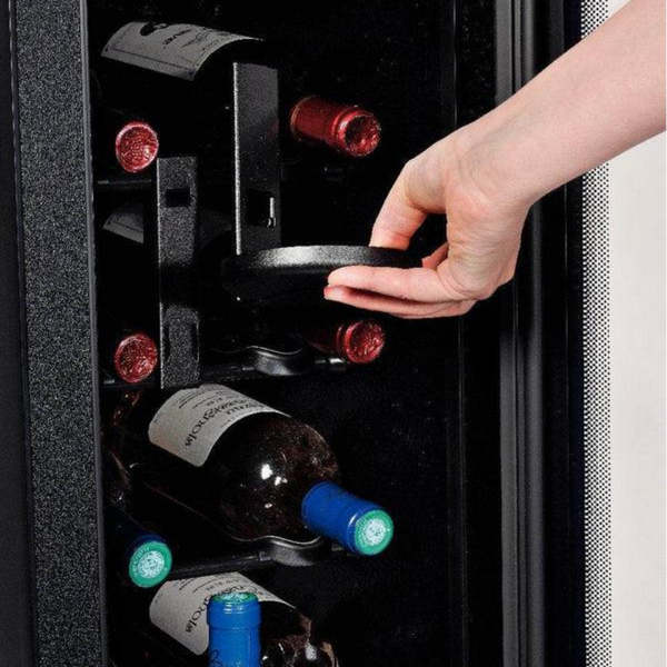 Design: Full glass door with anti-UV protection; Removable black handle; Glass plate on top; 10 bottles in horizontal and 2 bottles in vertical position; Tactile keyboard integrated in the door; Inner lighting.