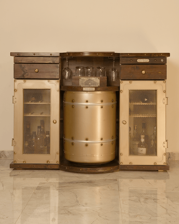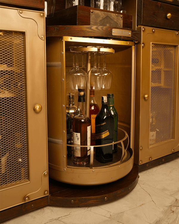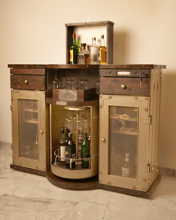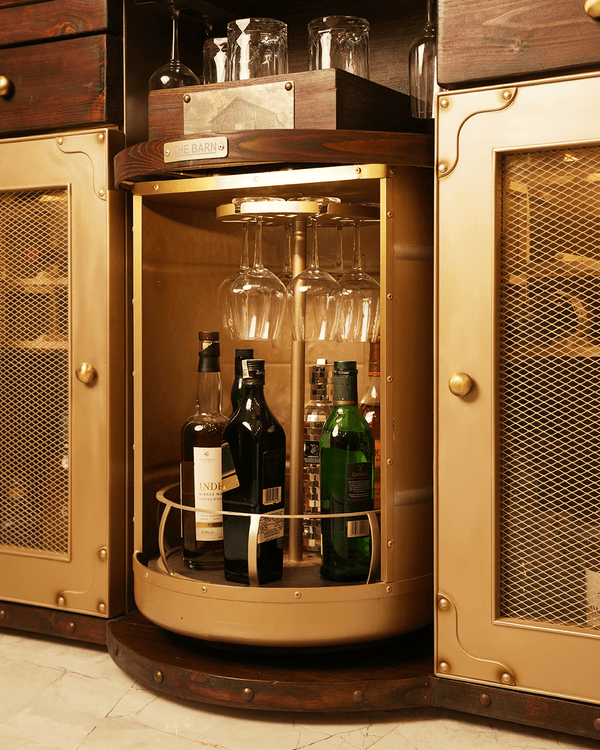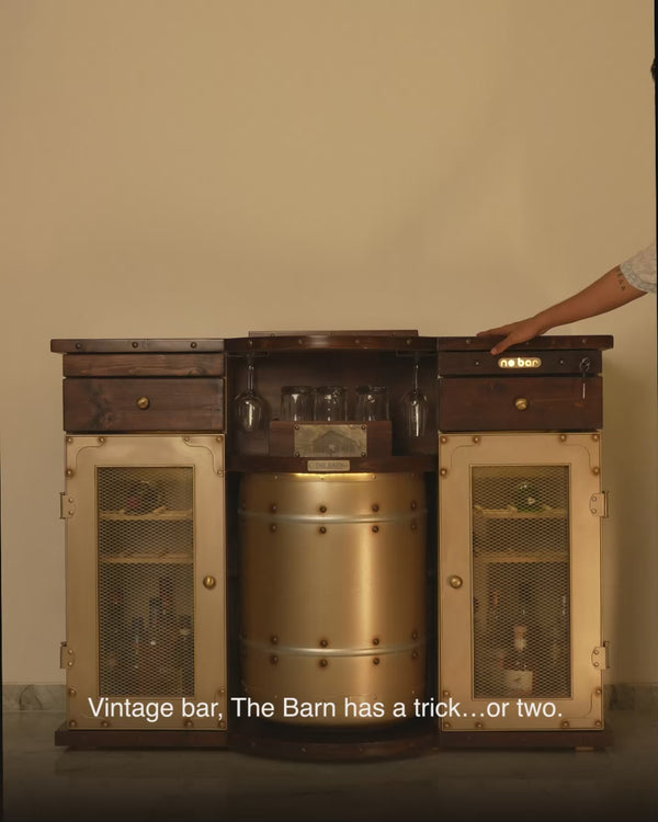 Spacious rustic bar with dual motion mechanism, the barn is a charmer. The Barn is designed to re live memories of the classic country life. Enjoy the feeling of finding a vintage, forgotten bottle, every time the barn is opened. The Barn is a quality product by no bar, a Lugano wood brand. The Barn has dual motion mechanism- vertical and rotational. Soft touch switch triggers the sequence of motion for bar to come alive with all lights on. Complete bar with sufficient storage. Shelves for bottles, Rack for wine bottles, Cabinet for glasses, hanger for goblets and drawers for accessories, side storage for big articles.