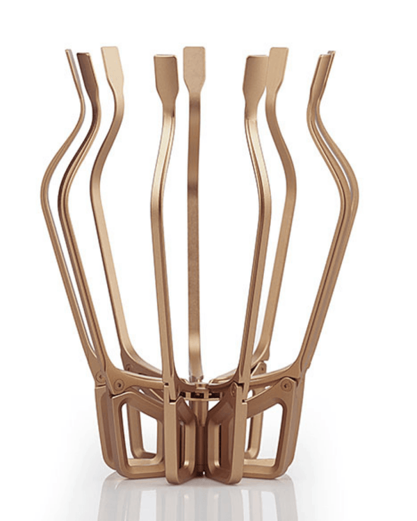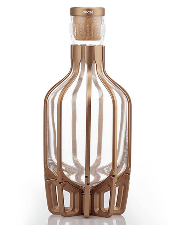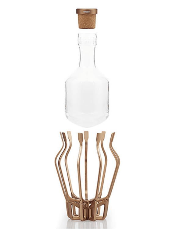 ou know the hosting game is won when guests sneak covert glances at your barware. Heck, everyone has a whisky decanter, but how about one that combines theatrical appeal with functional efficiency? Hand-blown, lead-free crystal glass forms the bold contours of the decanter. The unique conical base is complete only with its sturdy fins preventing your whisky from straying. A cork stopper perfectly fits into the neck, while the metal finish atop it adds to the contrasting appeal against clear glass. The weight-balance mechanism allows the decanter to seamlessly enter and exit the cage with synchronous movement. With its anodized gold finish, the sturdy aluminium base and fins are crafted for futuristic appeal. We’ve found the sweet spot between smooth edges and riveted contours.
