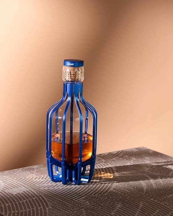 ou know the hosting game is won when guests sneak covert glances at your barware. Heck, everyone has a whisky decanter, but how about one that combines theatrical appeal with functional efficiency? Hand-blown, lead-free crystal glass forms the bold contours of the decanter. The unique conical base is complete only with its sturdy fins preventing your whisky from straying. A cork stopper perfectly fits into the neck, while the metal finish atop it adds to the contrasting appeal against clear glass. The weight-balance mechanism allows the decanter to seamlessly enter and exit the cage with synchronous movement. With its anodized gold finish, the sturdy aluminium base and fins are crafted for futuristic appeal. We’ve found the sweet spot between smooth edges and riveted contours.
