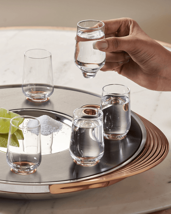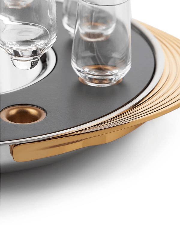 A spin on hosting experiences. The design is engineered to resemble a ballerina’s foot, providing this unique piece of barware absolute agility and frictionless movement. A sleek zamac body that reflects seamless hosting skill and a rich wooden base hosts 4 pairs of lead-free, tulip-shaped glasses. Closing in around it has sturdy handles resembling ripples; an ode to the fluidity and dynamism of water.