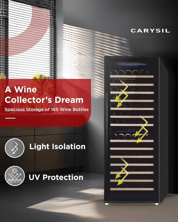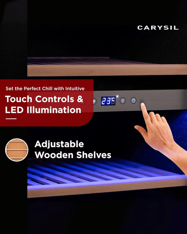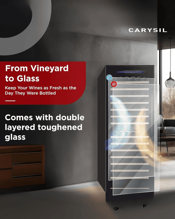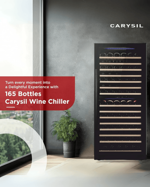 The Carysil Wine Chiller keeps your wine at the correct & consistent temperature and stable environment, protecting the wine from exterior lights and elements. Spacious, elegant, and efficient—thie 165 bottle Carysil Wine Chiller suits upscale kitchens or private bars. The 165-bottle capacity, precise controls, and refined design make it both functional and display-worthy.